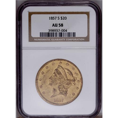 <B>1857-S $20 AU58 NGC.</B></I> Considerable luster remains with dark toning on both sides, doubtless from long-term storage. The surfaces on both sides are moderately abraded. Although this date became popular with recovery of the <I>S.S. Central America</B></I> treasury, it is likely that this coin was known prior to that discovery.