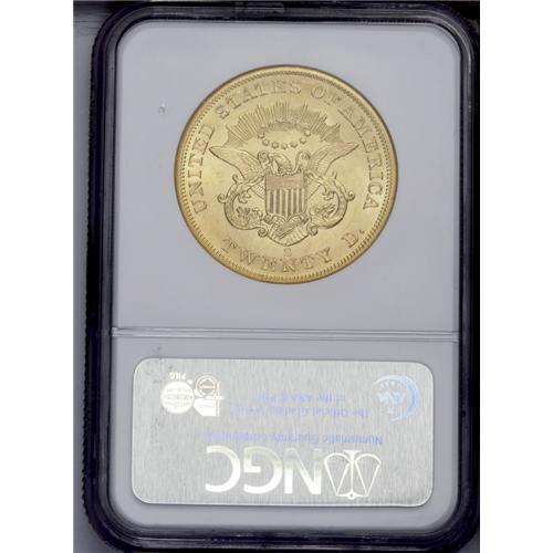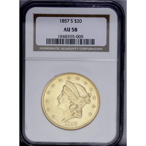 <B>1857-S<$20> AU58 NGC.</B></I> The light highpoint friction that keeps this lustrous yellow-gold coin from Mint State is difficult to spot. The well struck devices are largely clean, though the fields have scattered abrasions, including a few parallel abrasions that extend to the left from the tail.<BR><I>From The Clifton Rodenburg Collection.</B></I>