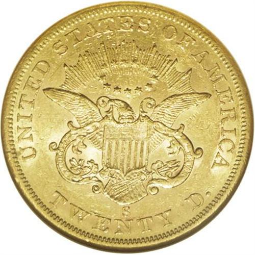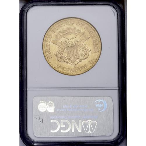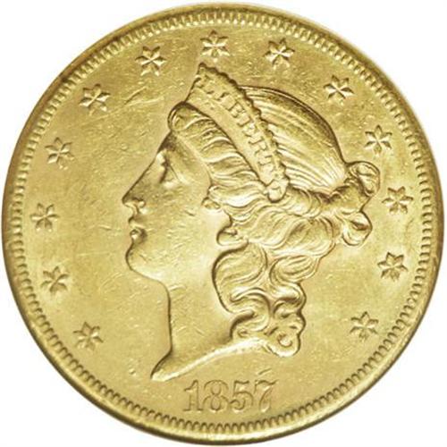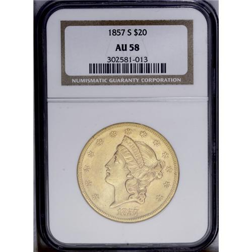 <B>1857-S $20 AU58 NGC.</B></I> The surfaces are typically abraded, but this double eagle has sharp details and ample luster for the grade. Bits of reddish patina cling to the devices, an indication that this piece is not of shipwreck origin.