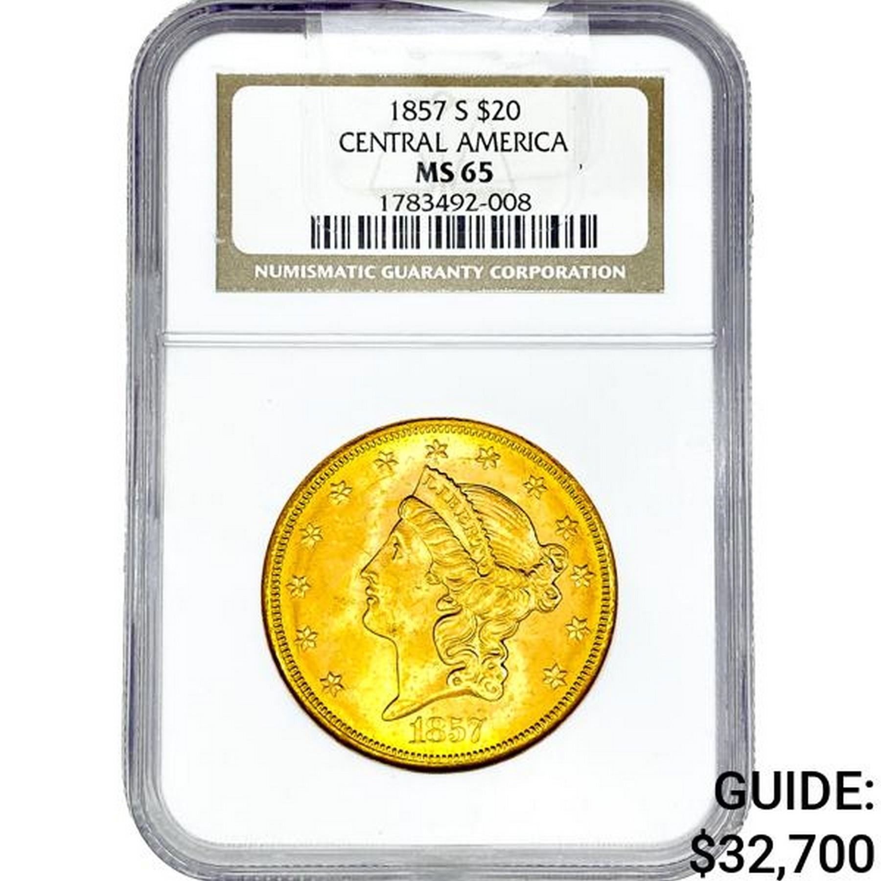 1857-S $20 Gold Double Eagle NGC MS65 Central Amer