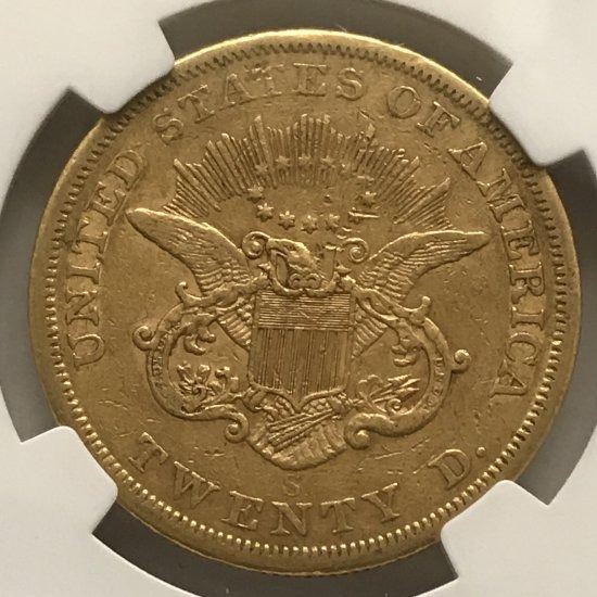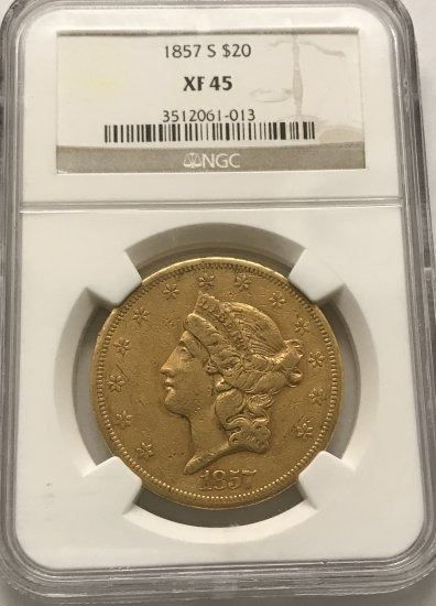 One 1857-S $20 Liberty Head Double Eagle Gold Coin NGC XF45.