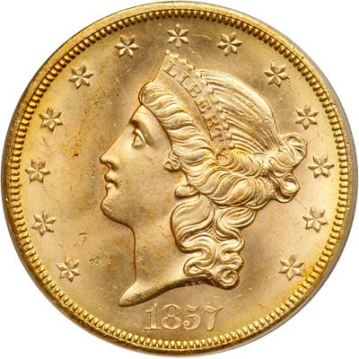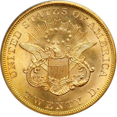 1857-S $20 Liberty. PCGS graded MS-64. Gold Foil Tag. S.S. Central America. 20 A Spiked Shield. SSCA 4155.
