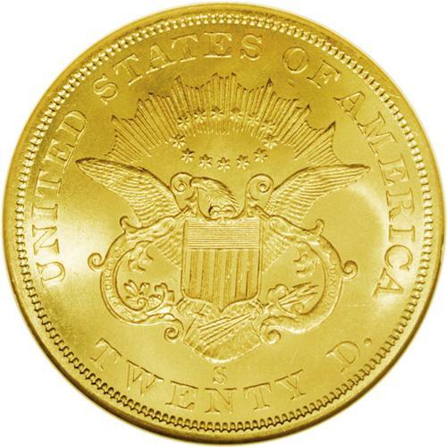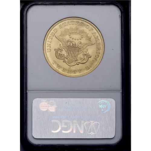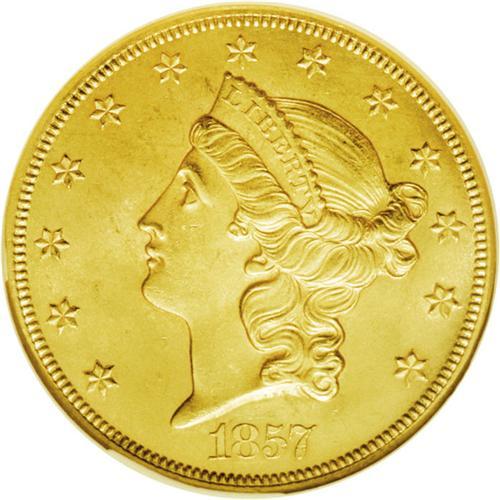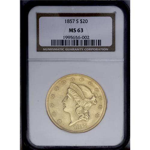 <B>1857-S<$20> MS63 NGC.</B></I> This is a technically superior example with pristine surfaces that are nearly unblemished. NGC chose to limit the grade because of rather matte-appearing, subdued luster, especially on the obverse. All of the design elements on both sides are boldly defined. Although not identified as such, it is likely that this example is from the <I>S.S. Central America</B></I> treasure. <BR><BR><B>Important notice:</B> Heritage usually auctions material at the rate of 200-250 lots per hour. On some occasions eBay Live bid software or the Internet may not be able to keep up with the pace of the auction. We recommend placing a realistic absentee bid now as insurance to avoid disappointment. Occasionally the auctioneer may eliminate or reject an eBay Live bid, and the auctioneer may also reopen a lot after the close of the eBay live bidding (usually because we missed an audience bid), and may reject your bid even if it shows you as the winning bidder. By bidding via eBay Live, you agree that Heritage may award the lot to another bidder at its sole discretion under the circumstances described above or any other reasonable circumstances. Since eBay bids are not shown to us until we open the lot on the floor, we treat those bids just like floor bids. In most cases the floor responds before the eBay bid is presented to us, due to Internet lag time, so for consistency we have made it a policy that floor bids are always considered first over tie eBay live bids. Also please note that all Heritage lots purchased through eBay Live carry a 20% Buyer's Premium. Please make sure you read the Terms and Conditions before you bid. This lot is being auctioned in conjunction with a live floor auction by Heritage Galleries & Auctioneers. All final auction and invoice information will be supplied by Heritage Galleries & Auctioneers, and all other information should be considered preliminary. Lot:4195 <BR><BR><B>Winning Notification and Billing:</B> After the FINAL session in this auction is complete, Heritage will send e-mail and snail mail invoices. This process normally takes several days. All final auction and invoice information will be supplied by Heritage Galleries & Auctioneers, and all other information should be considered preliminary. <BR><BR>This auction will be conducted on a live auction floor and over the Internet through eBay Live. If you choose to place an absentee bid, please take a moment to <font color='#0000ff'><u><a href='http://pages.ebay.com/liveauctions/help/before/laabsentee.html'>learn how eBay Live absentee bidding works</a></u></font><font color='#000000'>