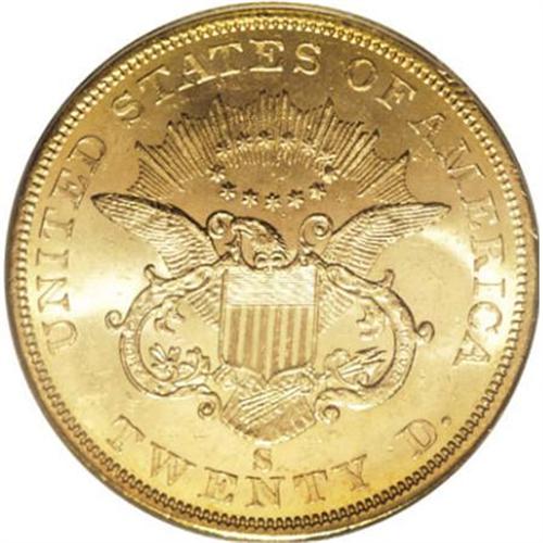 <B>1857-S $20 Bold S MS63 PCGS.</B></I> Ex: <I>S.S. Central America</B></I>. Variety 20B. SSCA 0900. Blazing luster radiates from both sides of this Select survivor from the <I>S.S. Central America</B></I>. A powerful strike leaves excellent definition over the design elements. Peach-gold surfaces display occasional traces of apricot, and just a few minute grade-defining marks. Housed in a gold-label PCGS holder.<BR><BR><b>Shipping:</b> Coins & Currency (<a target="_blank" href="http://www.heritageauctions.com/common/shipping.php">view shipping information</a>)