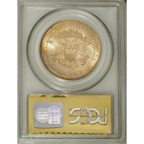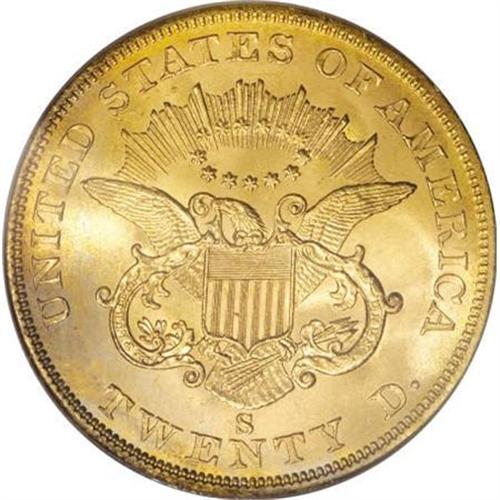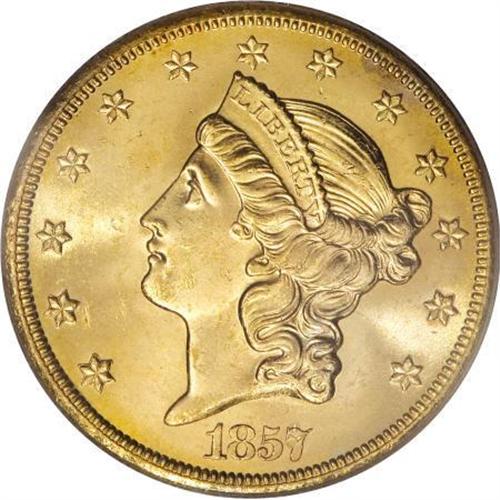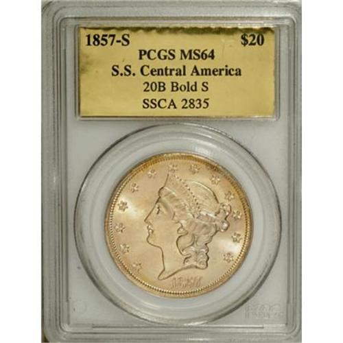 <B>1857-S $20 MS64 PCGS.</B></I> Ex: <I>S.S. Central America</B></I>. Variety 20B, Bold S. Satin surfaces brimming with rippling golden color host sharply struck, immensely appealing devices. The designs are marked by multiple light abrasions, but none detract from the general quality of the coin. This double eagle is accompanied by Certificate of Authenticity B2835 issued by the Columbus-American Discovery Group. Population: 39 in 64, 27 finer (7/07).<BR><BR><B>Coin Engraver:</B> James B. Longacre<BR><BR><b>Shipping:</b> Coins & Currency (<a target="_blank" href="http://www.heritageauctions.com/common/shipping.php">view shipping information</a>\)