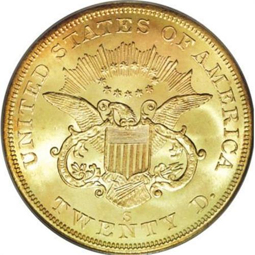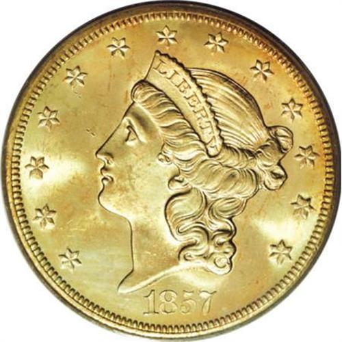 <B>1857-S $20 Spiked Shield MS64 PCGS.</B></I> Ex: <I>S.S. Central America.</B></I> SSCA 4789. The "Spiked Shield" is the most recognizable variety from the SSCA treasury trove of 1857-S double eagles. The present near-Gem has blazing luster and delicate peach toning. The fields are gorgeously unabraded, and the cheek and neck have only trivial grazes. A wonderful souvenir from this fabled shipwreck. Housed in a gold PCGS holder, and accompanied by a brown case from the California Gold Marketing Group.<BR><BR><b>Shipping:</b> Coins & Currency (<a target="_blank" href="http://www.heritageauctions.com/common/shipping.php">view shipping information</a>)