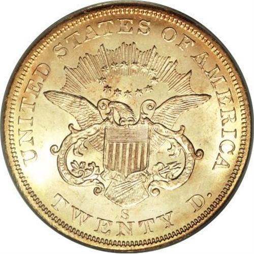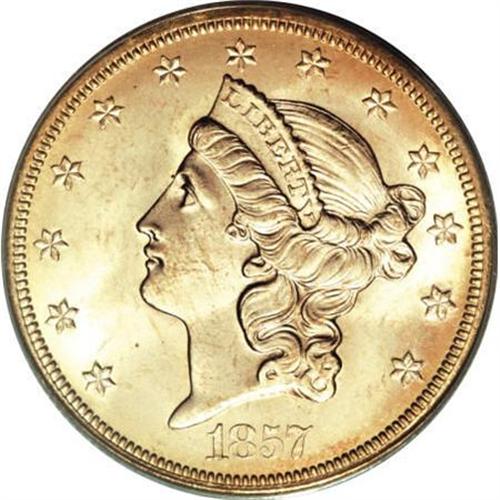 <B>1857-S $20 Spiked Shield MS64 PCGS.</B></I> <I>Ex: S.S. Central America.</B></I> Variety 20A. SSCA 3546. At first glance, this lustrous orange-gold shipwreck double eagle appears to be a Gem, since the fields are nearly unabraded. Moderate grazes on the cheek determine the grade. Included with this lot is a Certificate of Authenticity signed by Tommy Thompson, and a faux hardback book that holds the actual coin. Housed in its initial gold label holder.<BR><BR><b>Shipping:</b> Coins & Currency (<a target="_blank" href="http://www.heritageauctions.com/common/shipping.php">view shipping information</a>)