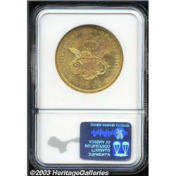 1857-S $20 MS65 NGC. 20A. Spiked Shield. Ex: S.S. Central America. Gem quality type collectors would be wise to pay special attention when this coin crosses the auction block. In the veritable absence of distracting blemishes, the surfaces radiate intense frosty luster that would captivate even the most casual observer. Every device displays razor sharp definition. Important notice: Heritage usually auctions material at the rate of 200-250 lots per hour. On some occasions eBay Live bid software or the Internet may not be able to keep up with the pace of the auction. We recommend placing a realistic absentee bid now as insurance to avoid disappointment. Occasionally the auctioneer may eliminate or reject an eBay Live bid, and the auctioneer may also reopen a lot after the close of the eBay live bidding (usually because we missed an audience bid), and may reject your bid even if it shows you as the winning bidder. By bidding via eBay Live, you agree that Heritage may award the lot to another bidder at its sole discretion under the circumstances described above or any other reasonable circumstances. Also please note that all Heritage lots purchased through eBay Live carry a 20% Buyer's Premium. Please make sure you read the Terms and Conditions before you bid.