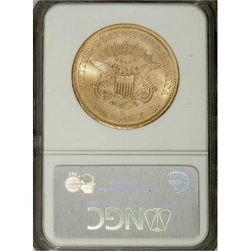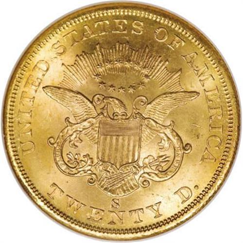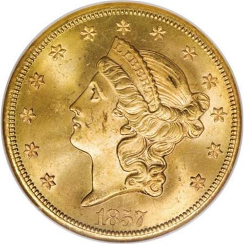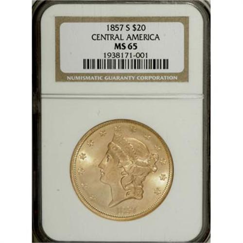 <B>1857-S $20 MS65 NGC.</B></I> EX: <I>S.S. Central America</B></I>. Until the discovery of the <I>S.S. Central America</B></I>, 1857-S double eagles were mostly available in grades of Very Fine to Extremely Fine. Writing about this issue, Jeff Garrett and Ron Guth (2006) say: "A few nice specimens were known, but none were choice pieces. The discovery of the <I>S.S. Central America</B></I> changed the landscape of collecting double eagles profoundly. There were more than 5,000 examples of the 1857-S double eagle aboard when the ship sank. Many of the examples found were in the same state of preservation as the day they left the Mint. The fabulous condition of the coins is what makes them so special; the shipwreck find made early double eagles available in high-grade condition."<BR> The <I>S.S. Central America</B></I> Gem offered here readily fits the profile outlined by Garrett and Guth. Smooth brassy-gold surfaces yield potent luster, and are devoid of significant marks. An impressive strike emboldens the design elements, further enhancing the coin's fabulous eye appeal. Census: 63 in 65, 23 finer (6/07).<BR><I>From The Carlton Woods Collection.</B></I><BR><BR><B>Coin Engraver:</B> James B. Longacre<BR><BR><b>Shipping:</b> Coins & Currency (<a target="_blank" href="http://www.heritageauctions.com/common/shipping.php">view shipping information</a>\)