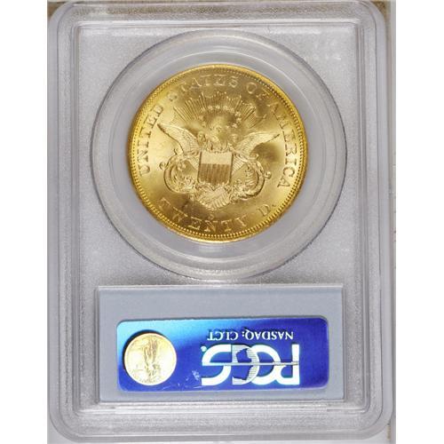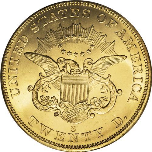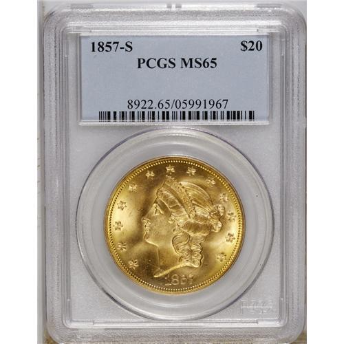 <B>1857-S $20 MS65 PCGS.</B></I> Variety 20A. Spiked Shield. Two short die scratches protrude from the lower left part of the shield. The 1857-S double eagle, with a mintage of 970,000 pieces, is available in the lower and middle grades of Mint State, but becomes somewhat more difficult to locate in higher levels of preservation. Full cartwheel luster explodes from both sides of this awesome Gem. The design elements are exquisitely struck, and impeccably preserved surfaces are adorned with beautiful peach-gold color.<BR><BR><b>Shipping:</b> Coin/Currency (<a target="_blank" href="http://www.heritageauctions.com/common/shipping.php">view shipping information</a>)