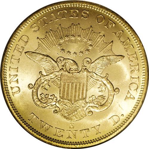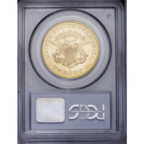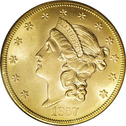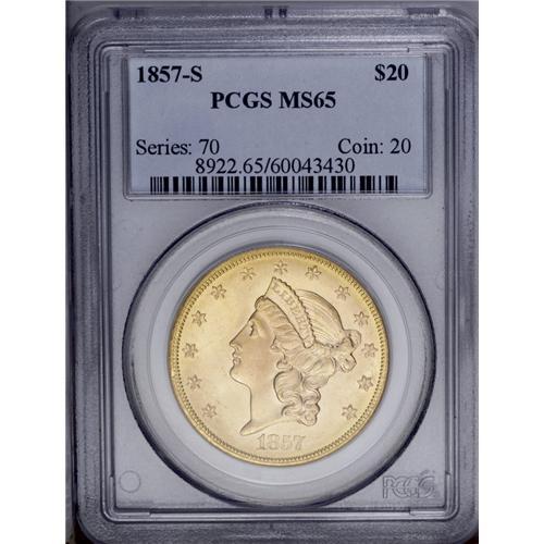 <B>1857-S $20 MS65 PCGS.</B></I> Vibrant luster and bold throughout. The surfaces are outstanding for a Type One double eagle, with a fresh, undiminished cheek on Liberty. The fields are also clean and show minimal signs of abrasions, although a small cluster resides near Liberty's nose. A strong strike brought up all the devices and stars to completeness.<BR> One can be reasonably certain that the present coin was recovered from the <I>S. S. Central America</B></I> shipwreck. Prior to a few groups of coins being pulled from ocean floor shipwrecks, the number of Type One double eagles that qualified for Gem grades was virtually nil. In the case of the 1857-S, the dominant date and mint found in that particular wreck, coins that qualified as Uncirculated were quite rare until the cargo was brought to the ocean surface and examined. Today, several thousand 1857-S double eagles are available in various mint state grades from the <I>S. S. Central America,</B></I> and this is one of the finer examples recovered. The PCGS holder does not included any reference to the <I>S. S. Central America</B></I> and the die variety is not noted either.