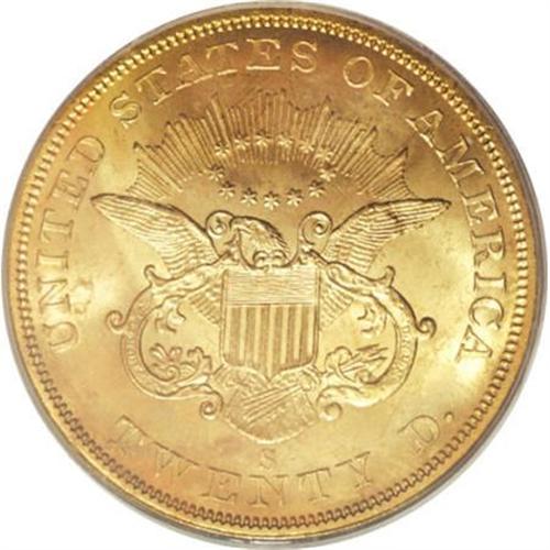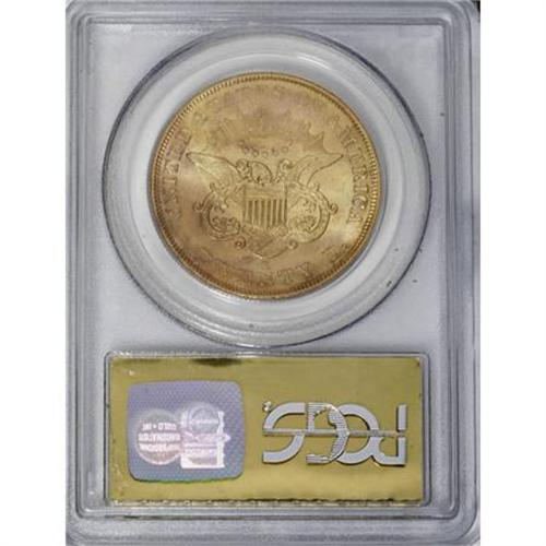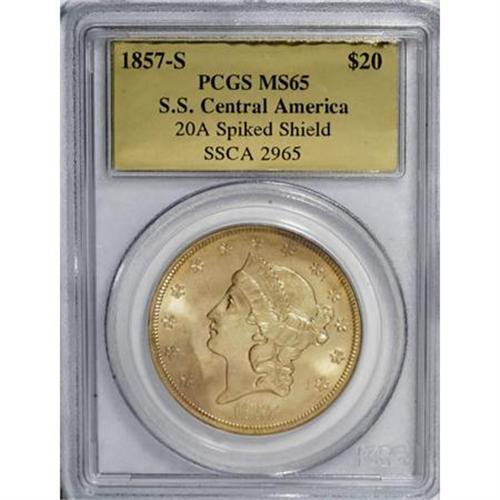 <B>1857-S $20 Spiked Shield MS65 PCGS.</B></I> Variety 20A. SSCA 2965. A remarkably unabraded Gem kept from an even finer grade by some dusky gray patina from 7 to 8 o'clock on the obverse, and from 4 to 10 o'clock on the reverse. An outstanding example of this famous shipwreck hoard issue. Lustrous, crisply struck, and housed in its initial gold label PCGS holder. Included with the lot is a red California Gold Marketing Group box, a faux book, and a certificate of authenticity signed by <I>S.S. Central America</B></I> expedition leader Tommy Thompson. The S.S. Central America sank on September 12, 1857, with approximately 435 lives lost. The wreck was located after several years effort in 1988, yielding a large bounty of double eagles.<BR><BR><b>Shipping:</b> Coins & Currency (<a target="_blank" href="http://www.heritageauctions.com/common/shipping.php">view shipping information</a>)