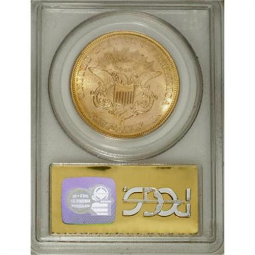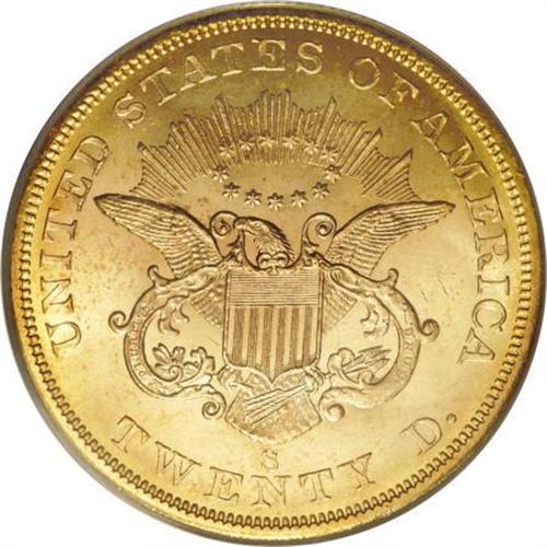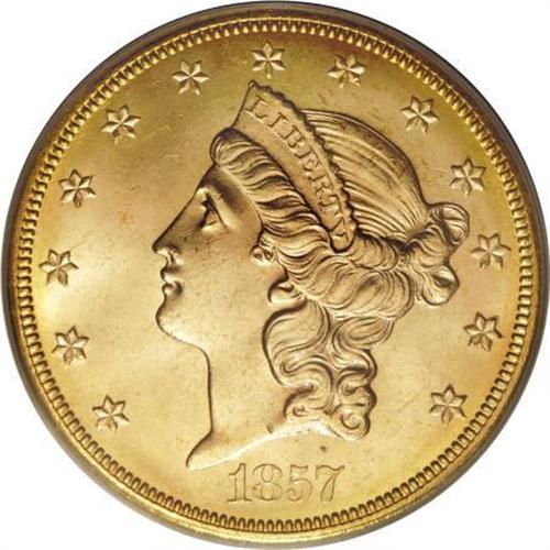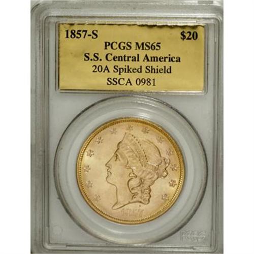 <B>1857-S $20 MS65 PCGS.</B></I> Ex: <I>S.S. Central America</B></I>. Variety 20A. SSCA 0981. Dazzling cartwheel luster illuminates this meticulously struck Gem. Only the M in UNUM lacks a precise impression. The reverse is remarkably unabraded, and the obverse field and Liberty's neck are also exceptionally smooth. Only faint grazes on the cheek serve to preclude a finer grade. Variety 20A is the "Spiked Shield" variety, named after the two slender die lines near the left border of the shield. Curator Robert Evans extensively studied the 1857-S double eagles recovered from the SSCA, and reported his findings in a July 2000 <I>Numismatist</B></I> article. Encapsulated in a gold label PCGS holder.<BR><I>From The Arroyo Grande Collection.</B></I><BR><BR><b>Shipping:</b> Coins & Currency (<a target="_blank" href="http://www.heritageauctions.com/common/shipping.php">view shipping information</a>)
