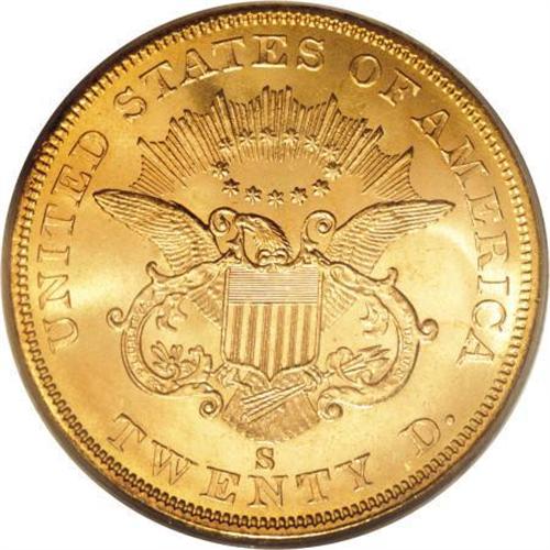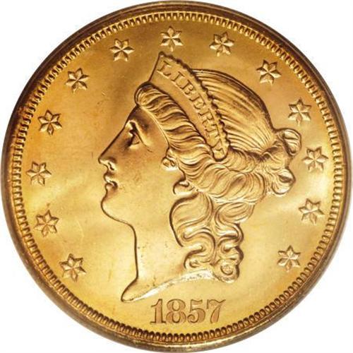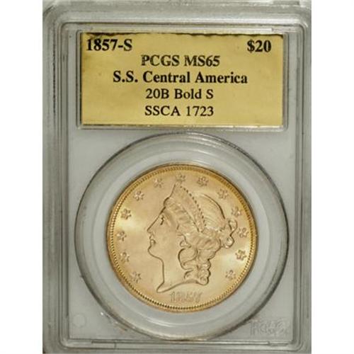 <B>1857-S $20 MS65 PCGS.</B></I> Variety 20-B, Bold S. Ex: <I>S.S. Central America</B></I>, SSCA 1723. In his <I>American Coin Treasures and Hoards</B></I>, Q. David Bowers (1997) notes that contemporary reaction to the <I>S.S. Central America</B></I> disaster reflected misplaced priorities; in his words, "there seemed to be more concern in the popular press about the loss of the gold aboard than there was about the fate of the passengers."<BR> On the re-discovery of the ill-fated ship in the late 1980s and the subsequent litigation over it, its cargo of gold was the center of attention once again. Eventually, a court decision awarded the vast majority of the sunken treasure to the salvors, a fortune that included numerous 1857-S double eagles such as the present Gem. The wheat-gold surfaces display vibrant luster, and the carefully preserved portrait shows solid definition. It ranks as one of the best-preserved examples recovered from the wreck. For all 1857-S double eagles, Population: 25 in 65, 2 finer (8/07).<BR><I>From The Arroyo Grande Collection.</B></I><BR><BR><B>Coin Engraver:</B> James B. Longacre<BR><BR><b>Shipping:</b> Coins & Currency (<a target="_blank" href="http://www.heritageauctions.com/common/shipping.php">view shipping information</a>)