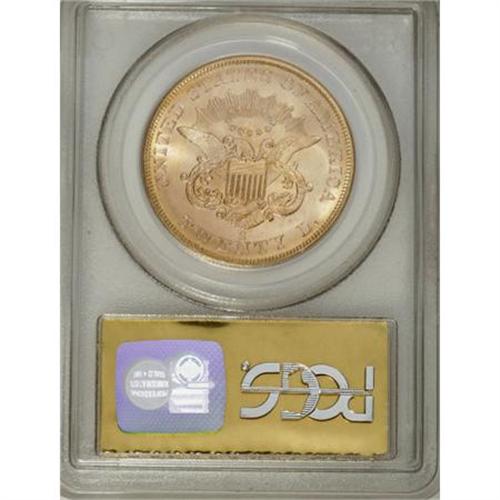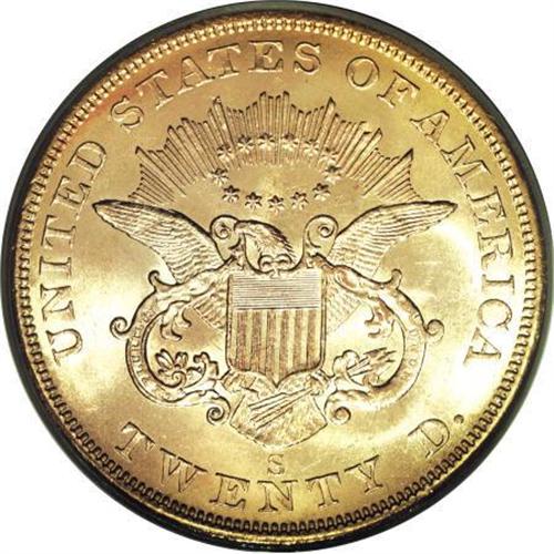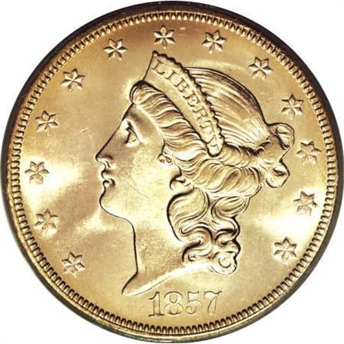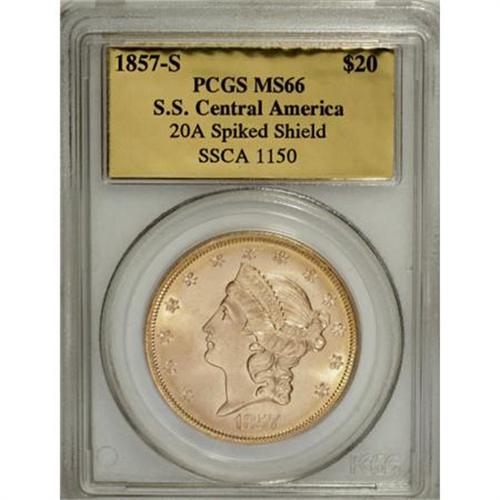 <B>1857-S $20 MS66 PCGS.</B></I> Ex:<I> S.S. Central America.</B></I> Variety 20-A, Spiked Shield. Garrett and Guth note that the "discovery of the <I>S.S. Central America </B></I>changed the landscape of collecting double eagles profoundly. There were more than 5,000 examples of the 1857-S double eagle aboard when the ship sank. Many of the examples found were in the same state of preservation as the day they left the Mint." The Spiked Shield variety of the present coin is the most common, but this piece is a nonetheless superlative example of this joyous and exuberant shipwreck issue. The wonderful orange-gold coloration complements gorgeous luster and enormous appeal. Comes with presentation box and COA.<BR><BR><B>Coin Engraver:</B> James B. Longacre<BR><BR><b>Shipping:</b> Coins & Currency (<a target="_blank" href="http://www.heritageauctions.com/common/shipping.php">view shipping information</a>)