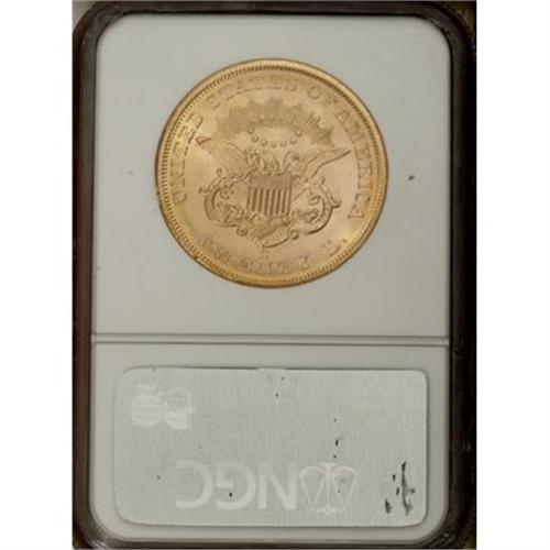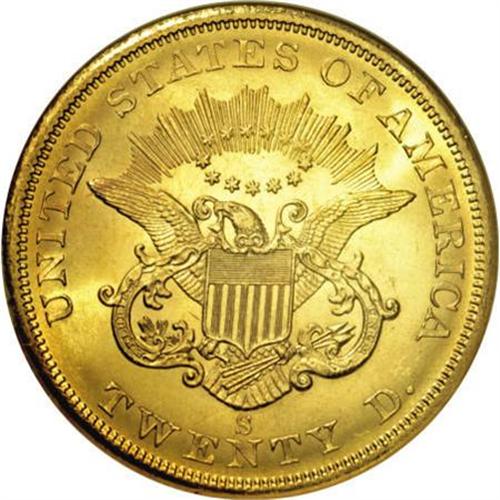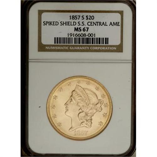 <B>1857-S $20 MS67 NGC.</B></I> Ex: <I>S.S. Central America. </B></I>It is difficult for modern-day collectors to envision how rudimentary--perhaps closer to nonexistent--the art of weather forecasting was in 1857. Needless to say, those considering an ocean voyage could not exactly turn on the television and get a week's worth of projections. What little weather forecasting was done for the seafaring public was a mixture of rudimentary science, old wives' tales, and guesswork. <BR> Q. David Bowers, in his <I>Guide Book of Double Eagle Gold Coins, </B></I>says that "few aboard the <I>S.S. Central America</B></I> in September 1857 knew or cared that travel in the Caribbean Sea and up the Atlantic Coast could be perilous ... . Hurricanes often struck without warning and with terrific force in the late summer season." It was perhaps even unknown that September is traditionally one the busiest months for hurricanes, and it is now known as "the Hurricane Month" among weather forecasters.<BR> And despite all the movie clichés of thieves and miscreants flailing wildly as they plunge to the depths, their soaking clothes overloaded with ill-gotten gains, there is nothing that devalues gold more quickly than the certain prospect of imminent drowning. Aboard the sinking ship, Bowers writes, "... a carpetbag filled with $16,500 in $20 gold pieces was too heavy to remove from a cabin, and Mrs. Jane Badger, who had packed it by emptying the coins from a trunk, left the golden array behind. Later, her husband, Capt. Thomas W. Badger, dumped the glittering coins from the bag onto the floor of the captain's stateroom. Several other men spread their coins about, amounting to an estimated several hundred thousand dollars' worth. Two ladies threw a further $10,000 worth of $20 gold pieces on the floor, but no one cared. Purses containing in some instances thousands of dollars in gold coins were left untouched on sofas."<BR> It is in this context that the Columbus-America Discovery Group, formed to seek the ship's grave and recover its treasure, undertook the monumental recovery of gold coins and other artifacts. The ship was rediscovered on September 11, 1987--almost exactly 130 years after the sea swallowed up the <I>Central America</B></I>. <BR> From the briny ocean depths, the 1857-S double eagle was the single issue most often found, to the extent of several thousand pieces, judging from the NGC/PCGS population data. But among all of those pieces and others recovered from the shipwreck of the <I>S.S. Republic,</B></I> there are only five examples of the 1857-S certified MS67 at NGC, with 11 pieces so graded at PCGS (12/07).<BR> The present coin is of the Spiked Shield variety, the most commonly found of the many different 1857-S variants constituting the <I>Central America</B></I> horde--but of course, in such an uncommon grade, this piece in essence becomes the ideal, tied-for-finest type coin to represent the fabled shipwreck and its equally legendary legacy. What first strikes the viewer is the roiling, swirling cartwheel luster present on the canary-yellow surfaces, which show a truly remarkable lack of abrasions of any size. Next one notices the full strike, which has completely delineated all the star centrils, the tiny individual strands of Liberty's hair, and all of the eagle's feathers. Of course, all of those individual attributes add up to enormous and memorable eye appeal, the most elusive numismatic criterion, but one that is present in spades on such a phenomenal treasure coin. <BR> Lastly, it must also be noted that this amazing coin is <I>among the finest Type One double eagles of any date, </B></I>as NGC and PCGS combined have certified only 16 pieces of the type in MS67.<BR> The current <I>Coin Dealer Newsletter </B></I>Bid price for the 1857-S is $90,250. Census: 5 in 67 (all varieties), 0 finer (12/07).<BR><BR><B>Coin Engraver:</B> James B. Longacre<BR><BR><b>Shipping:</b> Coins & Currency (<a target="_blank" href="http://www.heritageauctions.com/common/shipping.php">view shipping information</a>