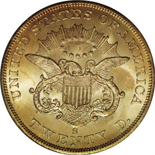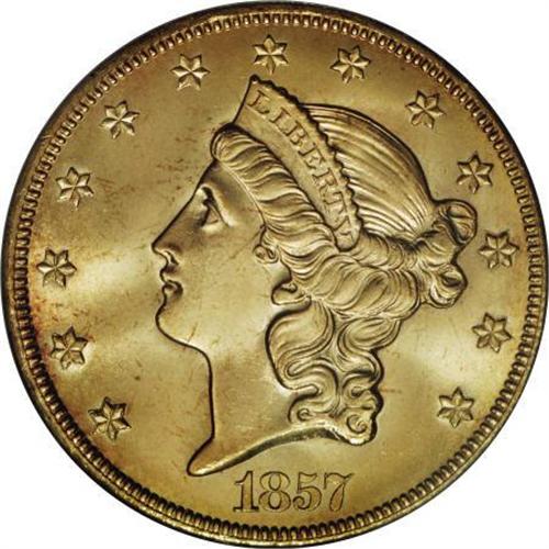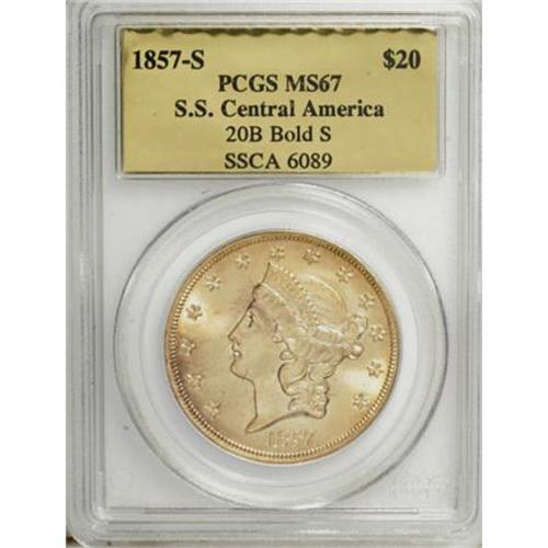 <B>1857-S $20 MS67 PCGS. CAC.</B></I> Ex: <I>S.S. Central America</B></I>. SSCA 6089. Variety 20B, Bold S. One of the foundations of coin collecting is the ideology of 'history in your hands.' Numismatists instinctively transport themselves back in time with each coin that they examine, whether it be an AR denarius of Julius Caesar from 46 B.C., one of America's first large copper cents, or even a common, circulated 1955 Franklin half dollar. That is the allure of this king of hobbies. Sometimes we visualize what a particular coin would have purchased back in the day, or we wonder if a famous person, such as Abraham Lincoln, actually spent the very coin that is in our hand. But, for the most part, our coin fantasies are fueled by a vivid imagination and little else. Seldom are we afforded the opportunity to own a coin that has a confirmed lineage to the day it was struck. The discovery of the 1857 <I>S.S. Central America </B></I>shipwreck in September 1987 provided one such rare opportunity. The subsequent salvage efforts revealed a staggering treasure of thousands of freshly minted gold coins and other important artifacts. All of the recovered coins are veritable time capsules, embedded with not only the history of an important era in America's history, but also the blood of some 435 souls who met with a watery grave on that dreadful day in September 1857. The coins, which went down with most of the crew and passengers, also represent the courageousness and tenacity of the men onboard who showed no fear while managing to save many women and children from a similar fate. <BR> Most of the coins recovered were in wonderful condition. That is not surprising, considering that they never had the chance to enter the channels of commerce. But some wonder how a coin, such as the current piece, could be so well preserved after being on the bottom of the ocean for 130 years. This question is easily addressed. The ship settled in 8,000 feet of water in an area where little to no current or agitation exists. In addition, gold is an extremely stable metal and salt water exposure imparts little effect. But more important is the fact that the coins were originally tightly stacked in wooden boxes, thus providing additional protection for coins in the interior of such piles (Bowers, 2004).<BR> The recover, certification and subsequent marketing of the <I>S.S. Central America's </B></I>golden cargo during the past two decades shattered old notions regarding the rarity and value of the 1857-S issue and changed the way type collectors approach the earliest double eagle design. Examining the PCGS <I>Population Report</B></I> reveals some astonishing statistics: in a total Type One Liberty double eagle population of slightly under 20,000 examples, 5,713 of them are dated 1857-S, a figure more than three times that of the next largest single-issue population. In all grades from MS63 up, the 1857-S population forms a clear majority of all Type One double eagles certified.<BR> Looking farther afield, even more impressive numbers appear. PCGS has certified 12 Type One Liberty double eagles in MS67; of those, 11 are 1857-S pieces. By comparison, PCGS has graded just one Type Two double eagle as a Superb Gem, and only nine Type Three representatives at that level. In other words, in the PCGS <I>Population Report</B></I>, the 1857-S has as many Superb Gem exemplars as all other Liberty double eagle issues combined (12/07).<BR> Despite this relative availability, the Superb Gem 1857-S issues remain condition rarities and are highly prized by type collectors and date collectors alike. This particular example offers vibrant luster and honey-gold, peach, and butter-yellow surfaces. The decisively struck devices and smooth fields are immaculate, and the overall visual appeal is magnificent. Simply put, this is one of the most important Liberty double eagles for the issue. Housed in a faux book with historical information and certificate of authenticity; comes with box from Blanchard.<BR><BR><B>Coin Engraver:</B> James B. Longacre<BR><BR><b>Shipping:</b> Coins & Currency (<a target="_blank" href="http://www.heritageauctions.com/common/shipping.php">view shipping information</a>)