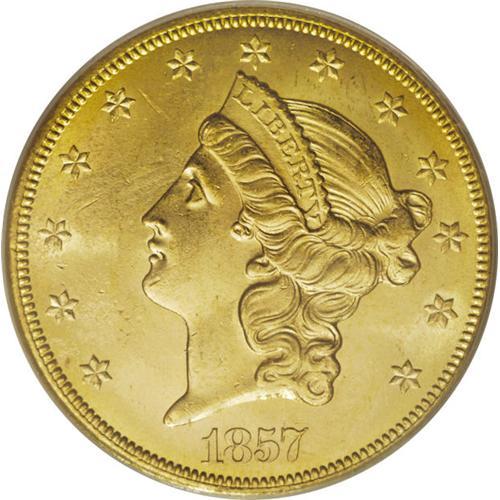 <B>1857-S $20 Narrow Serif MS62 PCGS.</B></I> Ex: <I>S.S. Central America.</B></I> Variety 20C. SSCA 1430. Highly lustrous yellow-gold surfaces exhibit only the slightest abrasions with minor haze in the obverse field. Light strike doubling is visible on a few letters of UNITED. In a PCGS gold label holder.<BR><BR><b>Shipping:</b> Coins & Currency (<a target="_blank" href="http://www.heritageauctions.com/common/shipping.php">view shipping information</a>)