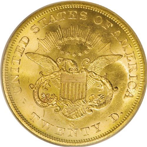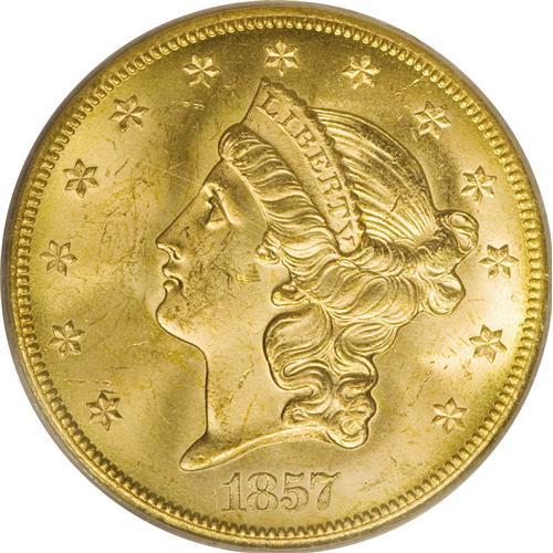 <B>1857-S $20 Narrow Serif MS64 PCGS.</B></I> Ex: <I>S.S. Central America.</B></I> Variety 20C. SSCA 1424. This is a gorgeous near-Gem example with highly lustrous and frosty yellow-gold surfaces that are accented by peripheral olive-gold toning. Only a few tiny abrasions keep it from the Gem category. In a PCGS gold label holder.<BR><BR><b>Shipping:</b> Coins & Currency (<a target="_blank" href="http://www.heritageauctions.com/common/shipping.php">view shipping information</a>)