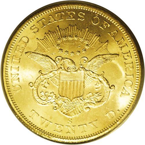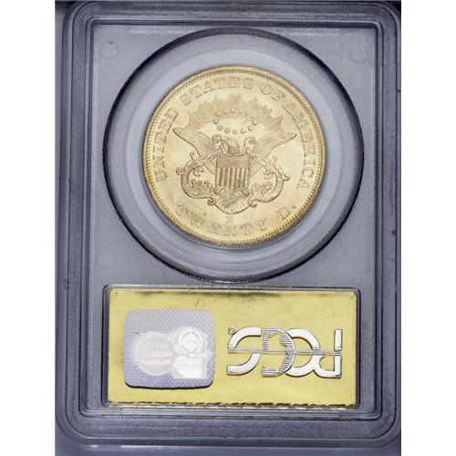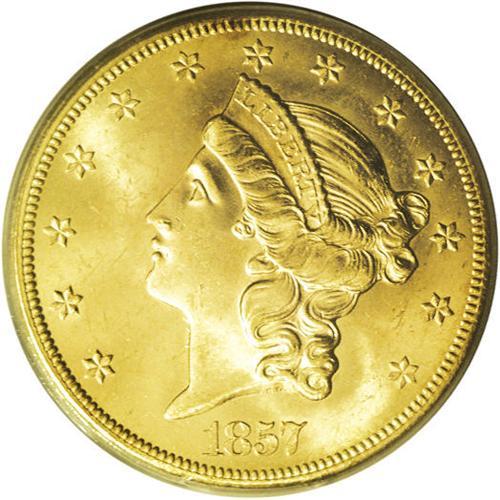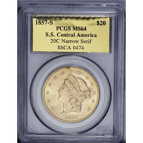 <B>1857-S<$20> Narrow Serif MS64 PCGS.</B></I> SSCA 0474. Variety 20C. The Narrow Serif variety is distinguished by a minute mint repair on the left serif of the U in UNITED. In his July 2000 <I>Numismatist</B></I> article on '57-S varieties, Robert Evans aptly noted this mint repair "resembles [the] shoulders and neck of [a] bottle lying on its side." This lustrous and intricately struck near-Gem is splendidly preserved aside from a wispy thin graze that points to Liberty's nose. <BR><I>From The Hamburg-Sonoma Collection.</B></I>
