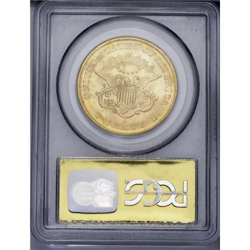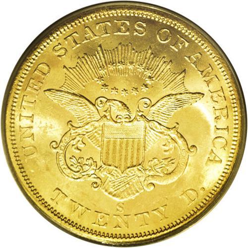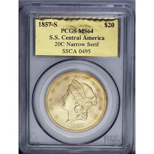 <B>1857-S<$20> Narrow Serif MS64 PCGS.</B></I> SSCA 0495. Variety 20C. This radiant and lustrous representative is generally yellow-gold, although a faint blush of gray is noted on the field near the profile. The reverse is well preserved, while the obverse exhibits only unimportant grazes. The major shipwreck recoveries of double eagles: the <I>S.S. Central America,</B></I> the <I>Brother Jonathan,</B></I> and the <I>S.S. Republic,</B></I> were all distributed within a ten year period. No comparable hoards are likely to surface again.<BR><I>From The Hamburg-Sonoma Collection.</B></I>