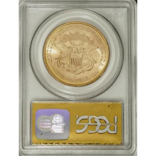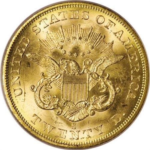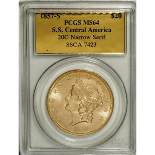 <B>1857-S $20 Narrow Serif MS64 PCGS.</B></I> Variety 20C. SSCA 7423. An exactingly struck and thoroughly lustrous Choice example with attractive preservation and fresh eye appeal. Housed in a gold label holder. A green California Gold Marketing Group box accompanies the lot, as do a faux "Ship of Gold" book and a certificate of authenticity.<BR><BR><b>Shipping:</b> Coins & Currency (<a target="_blank" href="http://www.heritageauctions.com/common/shipping.php">view shipping information</a>)
