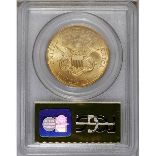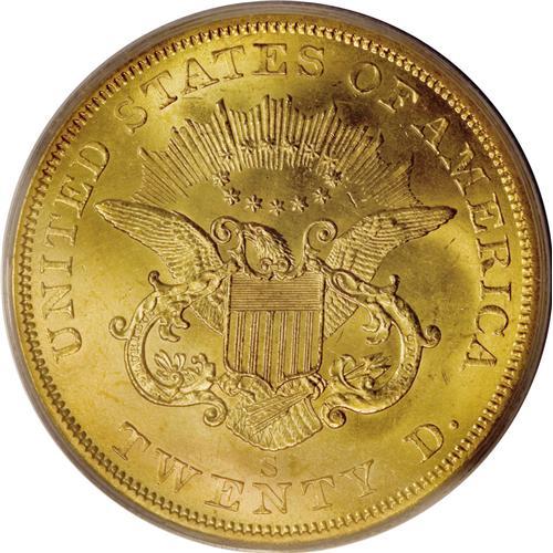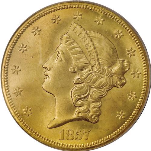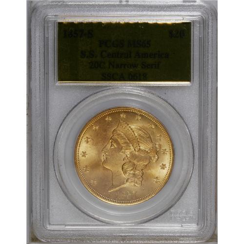 <B>1857-S $20 Narrow Serif MS65 PCGS.</B></I> SSCA 0618. Variety 20C. The left serif of the U in UNITED is repaired and thin. This is a gorgeous yellow-gold Gem with pleasing luster and remarkably unperturbed surfaces. There is scant indication that this lovely piece spent more than a century at the bottom of the Atlantic Ocean before being rescued from its maritime confines. Among the various shipwreck hoards, the <I>S.S. Central America</B></I> was by far the most significant to U.S. numismatics, for its bounty of gold assay bars in addition to its mother lode of Type One double eagles. Housed in its gold SSCA label PCGS holder.<BR><BR><b>Shipping:</b> Coins & Currency (<a target="_blank" href="http://www.heritageauctions.com/common/shipping.php">view shipping information</a>)