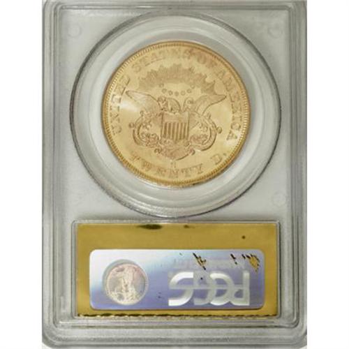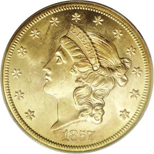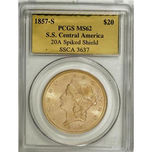 <B>1857-S $20 Spiked Shield MS62 PCGS.</B></I> Ex: <I>S.S. Central America</B></I>. Variety 20A. SSCA 3637. Highly lustrous and crisply impressed. The left obverse border has a few relatively unimportant marks, and a pinscratch is inconspicuously located at 8 o'clock on the reverse. Encapsulated in a gold label PCGS holder. Included with the lot is a forest-green box from Blanchard, a faux book, and a certificate of authenticity signed by <I>S.S. Central America </B></I>expedition leader Tommy Thompson.<BR><BR><b>Shipping:</b> Coins & Currency (<a target="_blank" href="http://www.heritageauctions.com/common/shipping.php">view shipping information</a>)