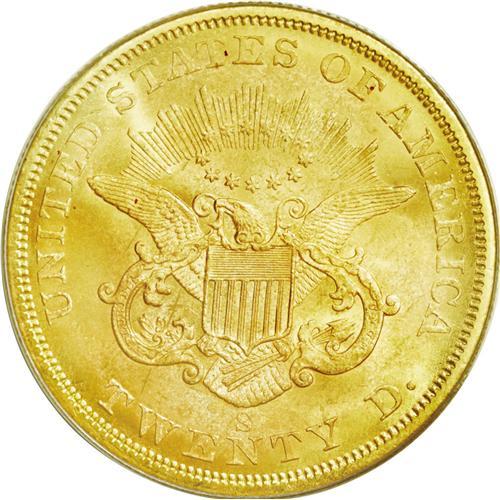 <B>1857-S<$20> MS64 PCGS.</B></I> Ex: <I>S.S. Central America.</B></I> Variety 20A, Spiked Shield. SSCA 3710. The obverse is spectacular and has the look of a higher grade, while the reverse is toned rich peach-gray with a more subdued appearance. Included with this lot is a Certificate of Authenticity signed by Tommy Thompson, a faux hardback book that holds the actual coin, an olive-green cardboard box from the California Gold Marketing Group, and a copy of Q. David Bowers' book, <I>American Coin Treasures and Hoards.</B></I>
