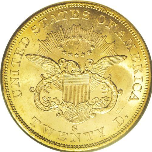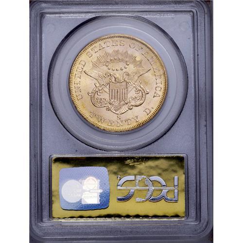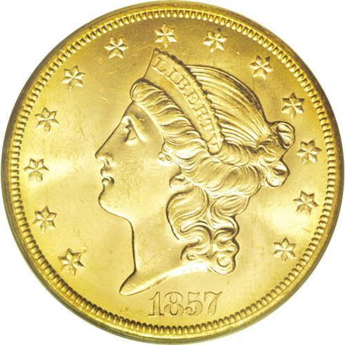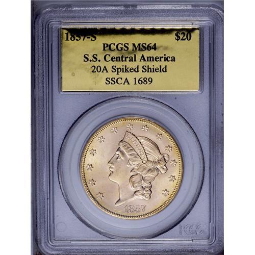 <B>1857-S<$20> Spiked Shield MS64 PCGS.</B></I> Ex: <I>S.S. Central America.</B></I> Variety 20A. SSCA 1689. An extremely well produced piece, with beaming luster and a nearly full strike. All star centrils show their full radial details, and the hair details are well sculpted. The surfaces are a beautiful golden-yellow, with the fields especially pristine and devoid of distractions. A small, undistracting grease stain left of the date and a couple of contact marks on the cheek apparently preclude a higher grade.