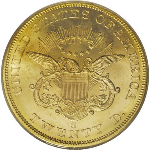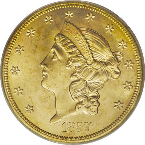 <B>1857-S $20 Spiked Shield MS64 PCGS.</B></I> Ex: <I>S.S. Central America.</B></I> Variety 20A. SSCA 2754. Fully lustrous surfaces are free of all but the most trivial abrasions. The surfaces are brilliant with frosty yellow-gold luster that is enhanced by splashes of faint olive and light orange toning. A diagonal die line along the left shield border just below the wing gives this variety its name. In a gold label PCGS holder.<BR><BR><b>Shipping:</b> Coins & Currency (<a target="_blank" href="http://www.heritageauctions.com/common/shipping.php">view shipping information</a>)