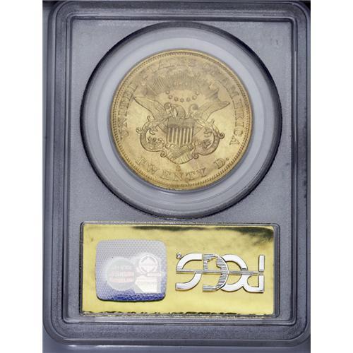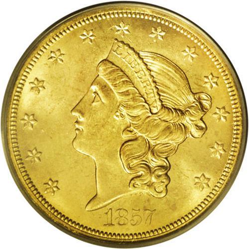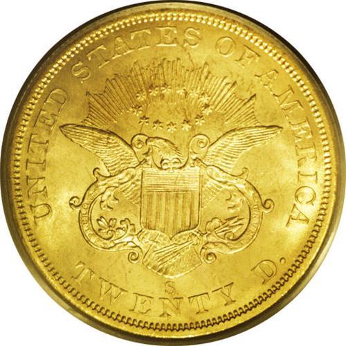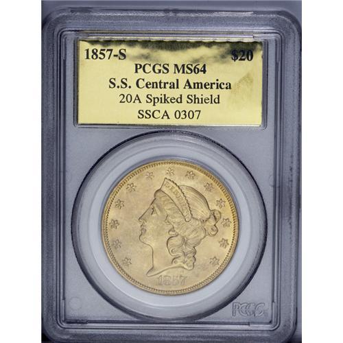 <B>1857-S<$20> Spiked Shield MS64 PCGS.</B></I> SSCA 0307. Luster sweeps across this dusky golden-gray near-Gem. Like many examples from the <I>S.S. Central America</B></I> shipwreck, the present piece is the Spiked Shield variety, named for a hair-thin die line that penetrates the left border of the shield. The reverse is gorgeously preserved, and the obverse shows only faint grazes. <BR><I>From The Hamburg-Sonoma Collection.</B></I>