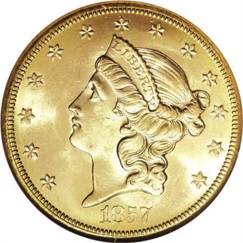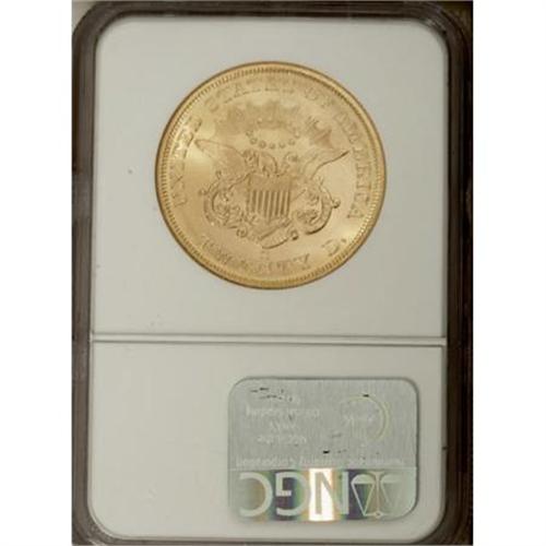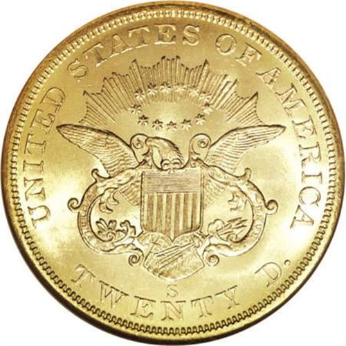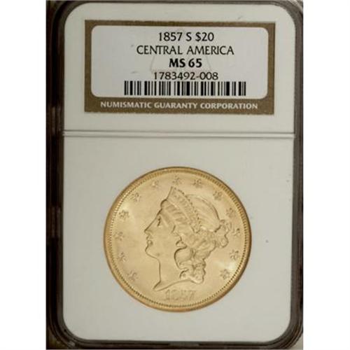 <B>1857-S $20 Spiked Shield MS65 NGC.</B></I> <I>Ex: S.S. Central America</B></I>. While not so indicated on the NGC holder, this Gem is the Spiked Shield variety, confirmed by two short die lines, one of which pierces the lower left part of the shield, and the other below and to the left that does not penetrate.<BR> Potent luster invigorates both sides of this gorgeous Gem, each revealing bright brassy-gold color. A solid strike imparts excellent definition to the design elements. Indeed, <I>Central America</B></I> survivors seem to show better detail than coins that are not from the hoard (Douglas Winter and Adam Crum, 2002, p. 113). A few inoffensive handling marks possibly preclude an even finer grade.<BR><BR><b>Shipping:</b> Coins & Currency (<a target="_blank" href="http://www.heritageauctions.com/common/shipping.php">view shipping information</a>)