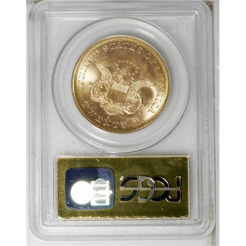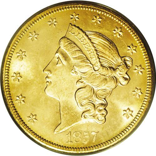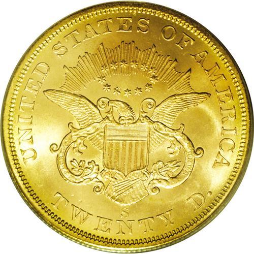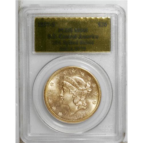 <B>1857-S<$20> Spiked Shield MS65 PCGS.</B></I> SSCA 0773. Variety 20A. A beautiful representative of the popular Spiked Shield variety, named for a light die line that crosses the shield's left border. The reverse of this well struck Gem is essentially immaculate, and the obverse is also clean despite a few unimportant ticks on the upper left field. Vibrant cartwheel luster and light pumpkin-orange toning ensure the eye appeal. Despite the recent recovery of the <I>S.S. Republic</B></I> shipwreck, the <I>S.S. Central America</B></I> remains the most numismatically significant shipwreck find, chiefly due to its bounty of formerly uncollectible gold assay ingots. Certified in a gold insert PCGS holder.
