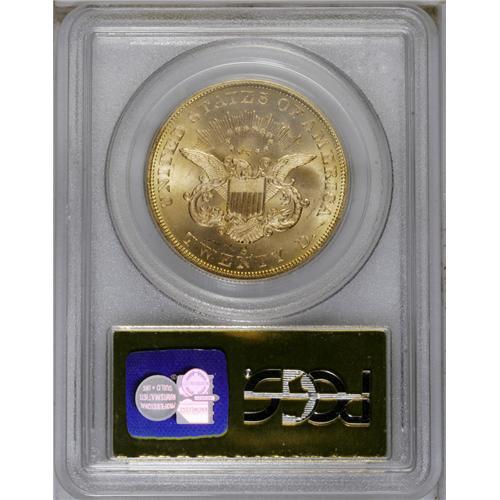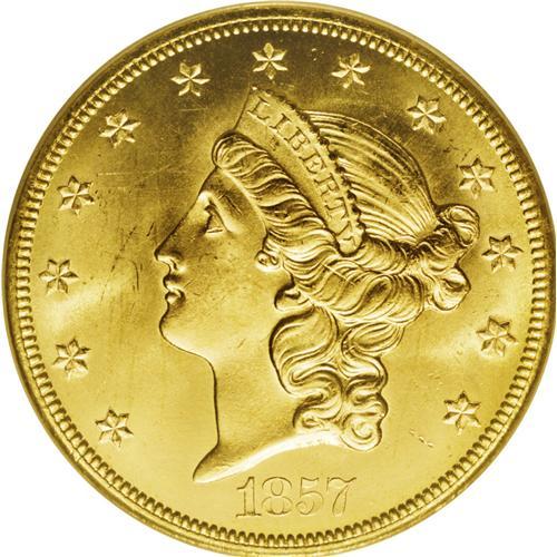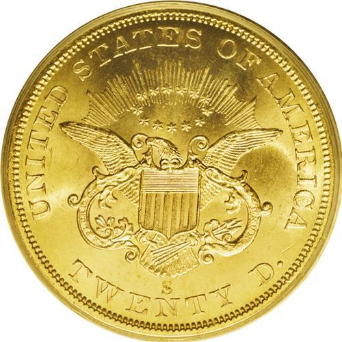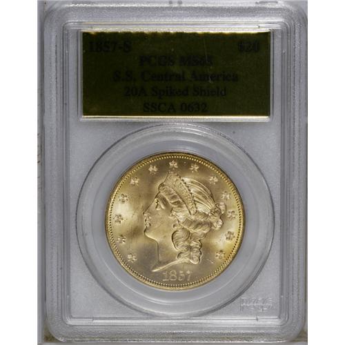 <B>1857-S $20 Spiked Shield MS65 PCGS.</B></I> Variety 20A. SSCA 0632. A pair of thin die lines near the left shield border identify the Spiked Shield variety. A lustrous and beautiful Gem with only incidental contact. This pleasing piece reveals no indication that spent more than a century at the bottom of the Atlantic Ocean. A trio of shipwrecks <I>(S.S. Central America, S.S. Brother Jonathan, S.S. Republic)</B></I> provided most surviving high grade Type One double eagles. The strike is needle-sharp aside from the top half of the mintmark. Included with this lot is a Certificate of Authenticity signed by expedition leader Tommy Thompson, a faux hardback book that holds the actual coin, and a Blanchard olive-green cardboard box.<BR><BR><b>Shipping:</b> Coin/Currency (<a target="_blank" href="http://www.heritageauctions.com/common/shipping.php">view shipping information</a>)