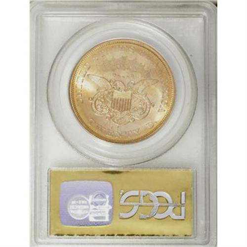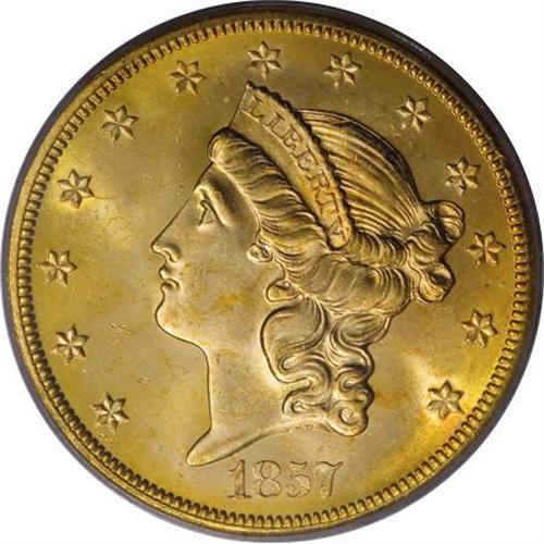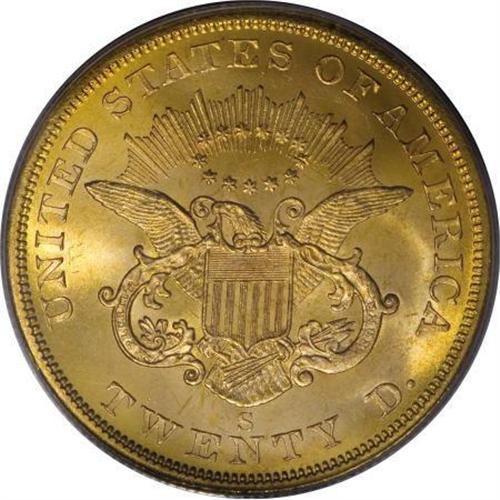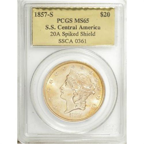 <B>1857-S $20 Spiked Shield MS65 PCGS.</B></I> Variety 20A. SSCA 0361. Peach toning graces the borders, and visits the fields and devices. Highly lustrous and exactingly struck. The reverse is gorgeously preserved, and the obverse has only faint distributed marks. The <I>S.S. Central America </B></I>sank on September 12, 1857, and its bounty of double eagles rested on the bottom of the Atlantic Ocean until the wreck was located in 1988 by the Columbus-America Discovery Group. Included with the lot is an olive-green box, a faux book, and a certificate of authenticity signed by expedition leader Tommy Thompson. Encapsulated in a gold label PCGS holder.<BR><BR><b>Shipping:</b> Coins & Currency (<a target="_blank" href="http://www.heritageauctions.com/common/shipping.php">view shipping information</a>)