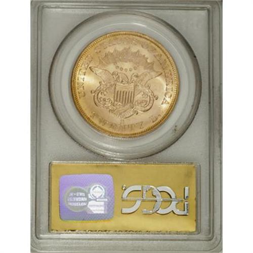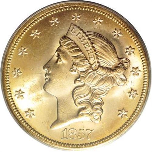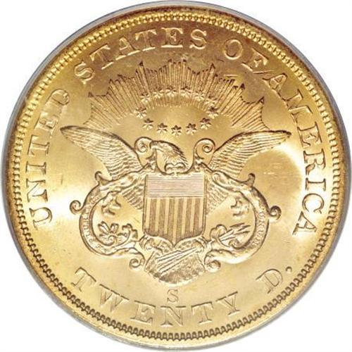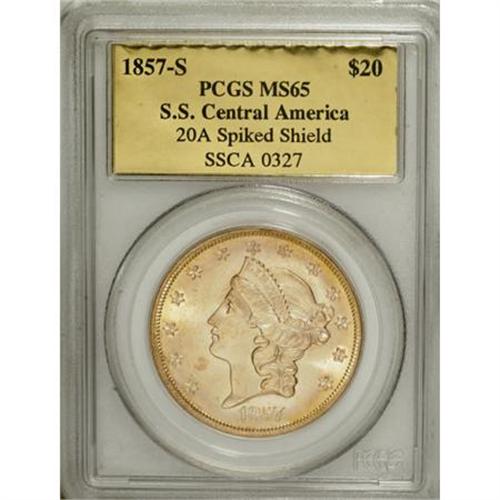 <B>1857-S $20 Spiked Shield MS65 PCGS. CAC.</B></I> Ex: <I>S.S. Central America</B></I>. Variety 20A. SSCA 0327. This lustrous Type One twenty has sun-gold toning near the rims, and a dash of peach patina near the chin. A hair-thin mark is seen between star 3 and Liberty's mouth, but the surfaces are generally smooth. Shipwreck recoveries of the <I>S.S. Central America</B></I>, the <I>S.S. Brother Jonathan</B></I>, and the <I>S.S. Republic </B></I>are responsible for most of the high grade Type One double eagles seen on the market today. Housed in a gold label PCGS holder.<BR><I>Ex: Bowers & Merena via private treaty.<BR>From The Madison Collection.</B></I><BR><BR><b>Shipping:</b> Coins & Currency (<a target="_blank" href="http://www.heritageauctions.com/common/shipping.php">view shipping information</a>)