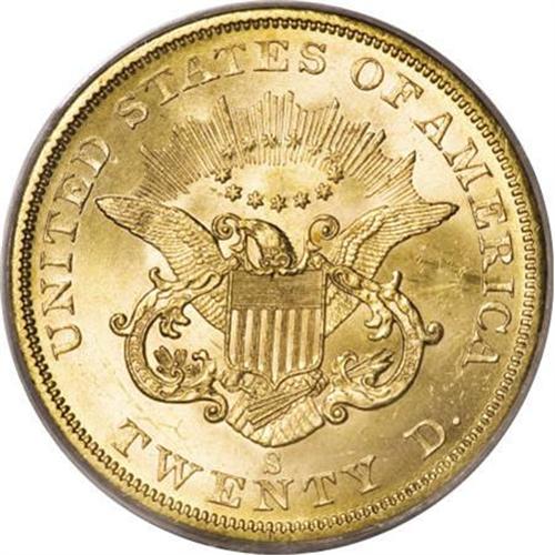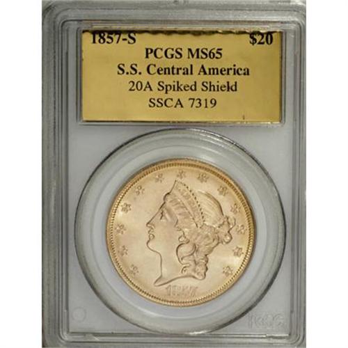 <B>1857-S $20 Spiked Shield MS65 PCGS.</B></I> Ex: <I>S.S. Central America. </B></I>Variety 20A. SSCA 7319. This canary-gold Gem provides blazing luster and a penetrating strike. Only the faintest grazes on each side deny an even higher numerical designation. The "Spiked Shield" variety is named for a slender diagonal die line through the left border of the eagle's shield. The black box of issue from the California Gold Marketing Group is included, in addition to two certificates of authenticity, one for the 1857-S twenty and another for a PCGS-encapsulated 1.5 gm pinch of gold, also included and recovered from the shipwreck. Certified in its initial gold label holder.<BR><I>From The Ultra Collection.</B></I><BR><BR><b>Shipping:</b> Coins & Currency (<a target="_blank" href="http://www.heritageauctions.com/common/shipping.php">view shipping information</a>)