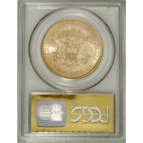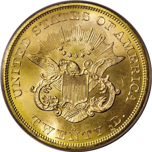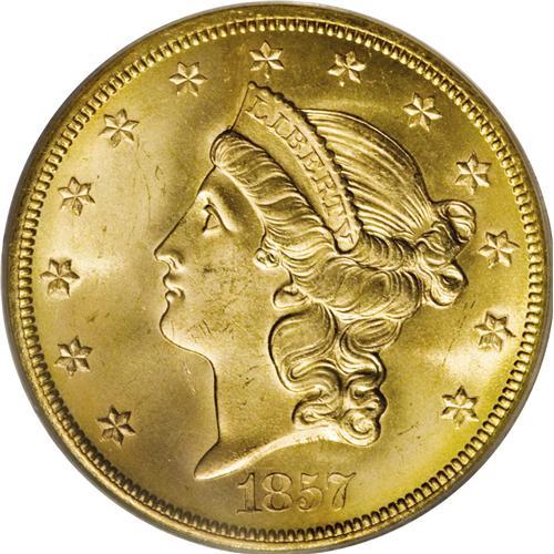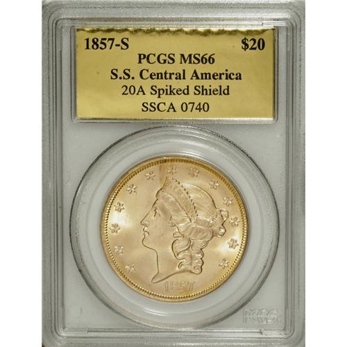 <B>1857-S $20 Spiked Shield MS66 PCGS.</B></I> Ex: <I>S.S. Central America.</B></I> Variety 20A. SSCA 0740. This die is easily identified by two short die scratches at the lower left corner of the shield. Jeff Garrett and Ron Guth, in their <I>Encyclopedia of U.S. Gold Coins, 1795-1933,</B></I> indicate that prior to 1985, the 1857-S double eagle was mostly available in grades of Very Fine to Extremely Fine; few choice pieces were known. The discovery of the <I>S.S. Central America</B></I> changed the landscape of double eagle collecting. The authors state: "There were more than 5,000 examples of the 1857-S double eagles aboard when the ship sank. Many of the examples found were in the same state of preservation as the day they left the mint."<BR> This Premium Gem survivor displays bright brass-gold surfaces with great luster. A powerful strike translated into excellent definition on the design elements, further enhancing the coin's outstanding eye appeal. Both sides are impeccably preserved. Housed in a gold label PCGS holder. Coin comes with SS Central America display box and certificate of authenticity. PCGS has seen fewer than 10 finer (3/07).<BR><BR><b>Shipping:</b> Coins & Currency (<a target="_blank" href="http://www.heritageauctions.com/common/shipping.php">view shipping information</a>)