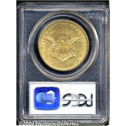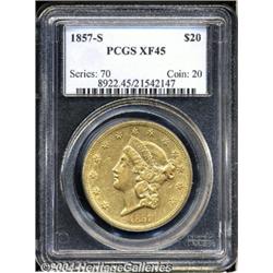 <B>1857-S<$20> XF45 PCGS.</B></I> The surfaces are typically abraded, but this Double Eagle has sharp details and ample luster for the grade. Bits of reddish patina cling to the devices, an indication that this piece is not of shipwreck origin. <BR><BR><B>Important notice:</B> Heritage usually auctions material at the rate of 200-250 lots per hour. On some occasions eBay Live bid software or the Internet may not be able to keep up with the pace of the auction. We recommend placing a realistic absentee bid now as insurance to avoid disappointment. Occasionally the auctioneer may eliminate or reject an eBay Live bid, and the auctioneer may also reopen a lot after the close of the eBay live bidding (usually because we missed an audience bid), and may reject your bid even if it shows you as the winning bidder. By bidding via eBay Live, you agree that Heritage may award the lot to another bidder at its sole discretion under the circumstances described above or any other reasonable circumstances. Since eBay bids are not shown to us until we open the lot on the floor, we treat those bids just like floor bids. In most cases the floor responds before the eBay bid is presented to us, due to Internet lag time, so for consistency we have made it a policy that floor bids are always considered first over tie eBay live bids. Also please note that all Heritage lots purchased through eBay Live carry a 20% Buyer's Premium. Please make sure you read the Terms and Conditions before you bid.
