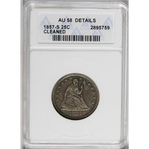 1857-S 25C --Cleaned--ANACS. AU58 Details. Nicely detai