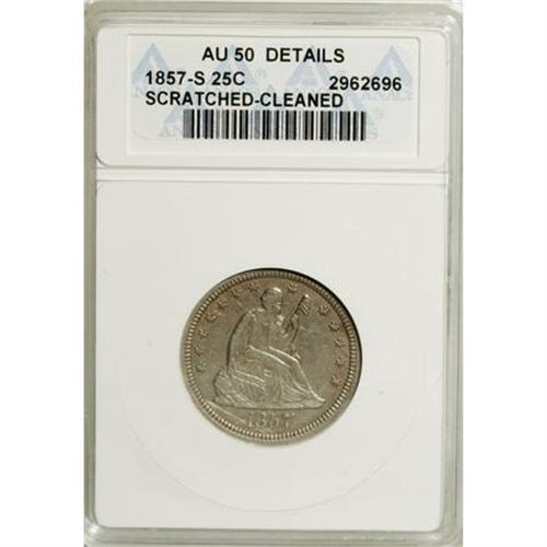 <B>1857-S 25C --Scratched, Cleaned--ANACS. AU50 Details.</B></I> A minutely granular and slightly subdued slate-gray and chestnut-tan example of this early and low mintage S-mint quarter. A few faint hair-thin marks near the 18 in the date provide a minor distraction.<BR><BR><b>Shipping:</b> Coins & Currency (<a target="_blank" href="http://www.heritageauctions.com/common/shipping.php">view shipping information</a>)