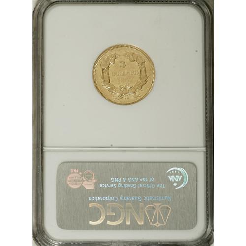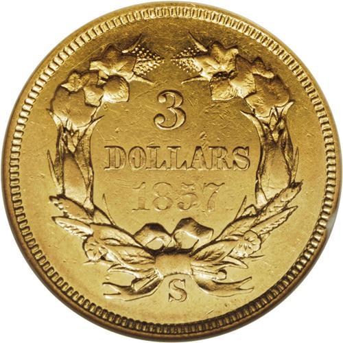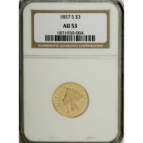 1857-S $3 AU53 NGC. Despite a production of only 14,00