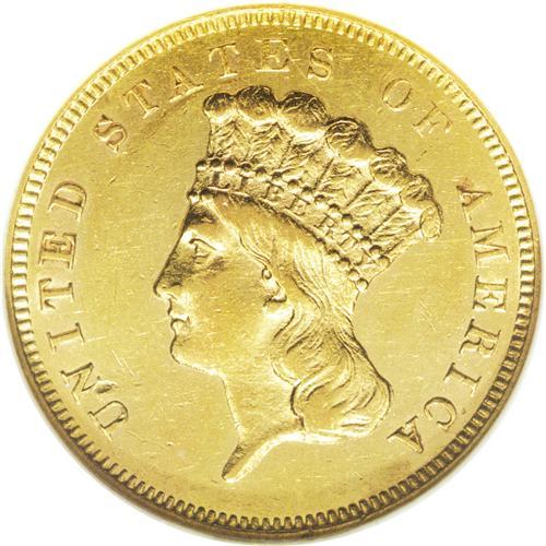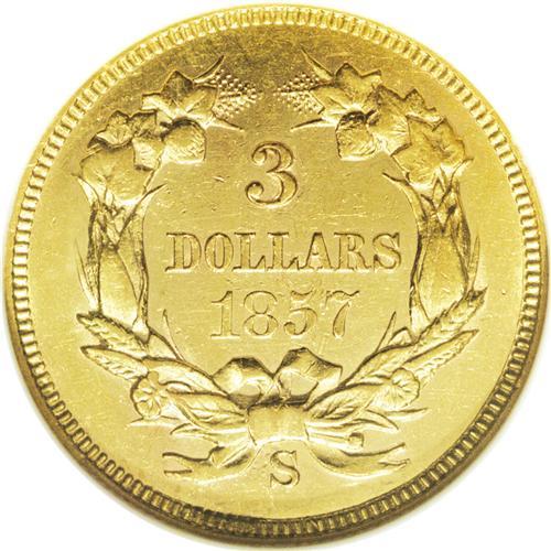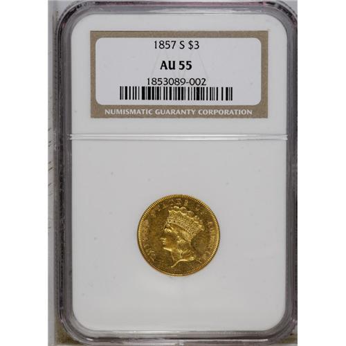 <B>1857-S $3 AU55 NGC.</B></I> The original mintage of 14,000 pieces is not exceptionally low for the series, but relatively few examples of this San Francisco Mint issue have survived, especially at grade levels above XF; and only four pieces have been certified in Mint State (three at NGC; just one by PCGS).<BR> This visually enticing Choice AU representative displays rich coloration and somewhat bright fields. The design motifs are well impressed, while an interesting strike-through (not detrimental to the technical grade) occurs just left of and below the mintmark. The piece is moderately worn and exhibits numerous shallow marks and hairlines in the fields. A few heavier abrasions are noted around the 5 in the date, near the reverse center. Despite such minor detractions, this conditionally scarce coin should attract considerable attention from serious bidders when it crosses the auction block. Census: 21 in 55, 11 finer (10/06).<BR><BR><b>Shipping:</b> Coin/Currency (<a target="_blank" href="http://www.heritageauctions.com/common/shipping.php">view shipping information</a>)
