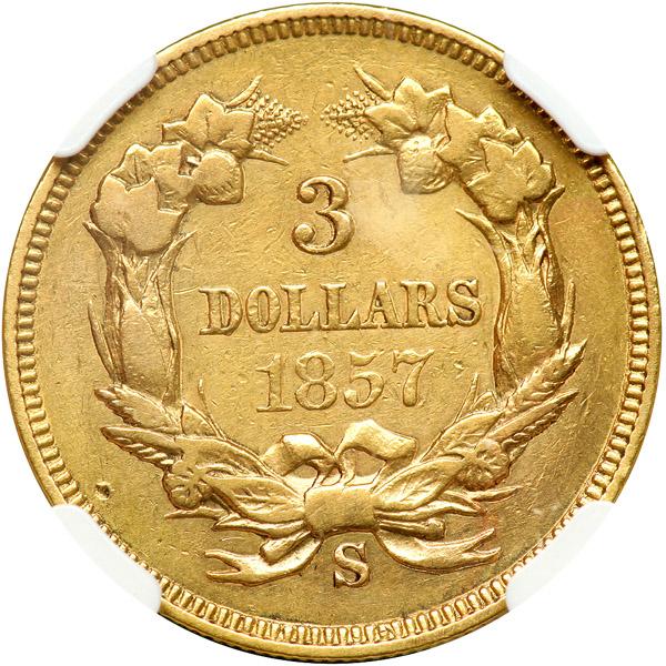 1857-S. NGC XF Details, whizzed. Nice details with even honey color gold toning. Only 14,000 struck (PCGS # 7977) .