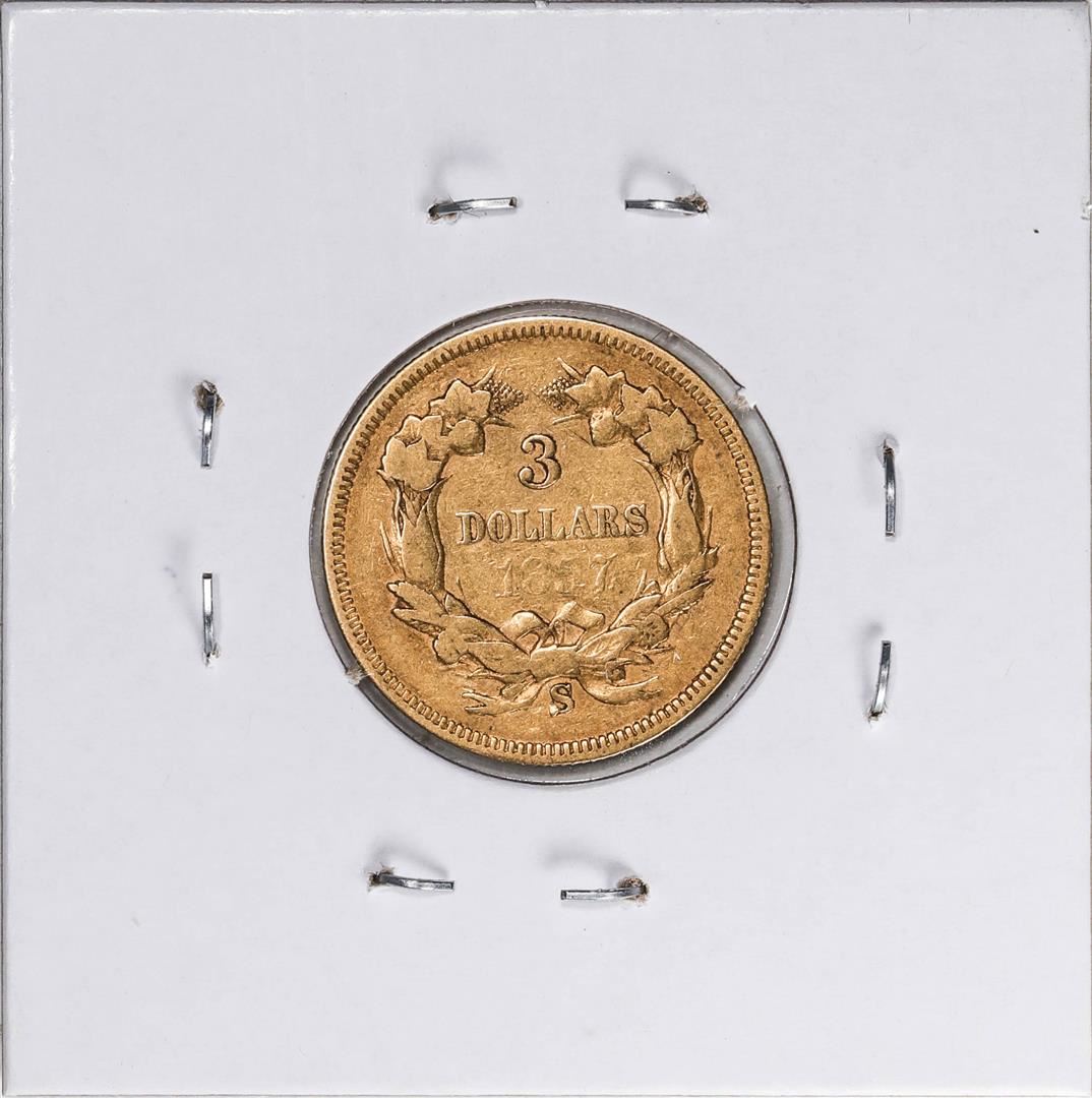 One 1857-S $3 Indian Princess Head Gold Coin.