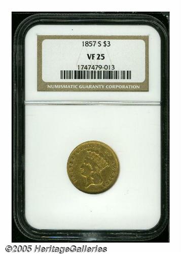 <B>1857-S<$3> VF25 NGC.</B></I> This is a scarce issue in all grades whose original mintage is only 14,000 pieces. The coin offered here has yellow-gold surfaces that are lightly abraded. The design elements reveal nice definition for the grade.
