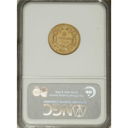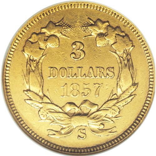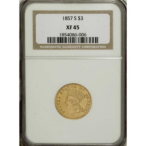 <B>1857-S $3 XF45 NGC.</B></I> The 1857-S three dollar is scarce in any grade, and is a formidable rarity in Mint State, as most San Francisco Mint threes were used extensively in commerce on the West Coast. David Bowers (2005) writes that: "The vast majority of coins appearing on the market ... have been in grades of VF and EF, not often even AU." The present XF45 example displays bright yellow-gold surfaces with a light green cast. The design elements are sharply defined, except for light wear on portions of the hair and some of the leaf ribbing. The few tiny marks scattered about do not detract from the coin's overall pleasing eye appeal.<BR><BR><b>Shipping:</b> Coins & Currency (<a target="_blank" href="http://www.heritageauctions.com/common/shipping.php">view shipping information</a>)