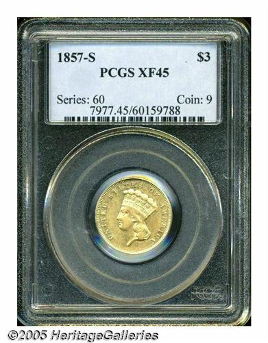 <B>1857-S<$3> XF45 PCGS.</B></I> Somewhat softly struck on the date, but boldly detailed elsewhere, with very light, even wear, for the grade level, and only the most trivial of surface marks. With an original mintage of only 14,000 pieces, this frontier era S-mint issue is quite scarce in the higher circulated grades. Population: 16 in 45, 37 finer (4/05).