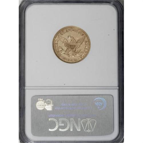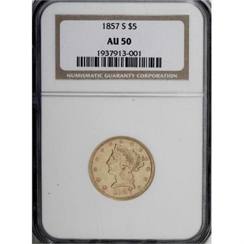 <B>1857-S $5 AU50 NGC.</B></I> The 1857-S saw extensive use in the daily commerce of the California Gold Rush, and most survivors are well circulated (Jeff Garrett and Ron Guth, 2006). This bright brassy-gold example with traces of luster in the recesses is one of the few survivors in high grade. Excellent definition shows on the motifs, and both sides are minimally abraded. Census: 9 in 50, 56 finer (6/07).<BR><BR><b>Shipping:</b> Coins & Currency (<a target="_blank" href="http://www.heritageauctions.com/common/shipping.php">view shipping information</a>)